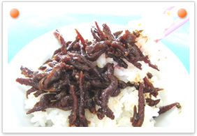 いかなごの間に小さなアワが出るくらい煮汁が減ったら、火を弱め落とし蓋を取り、全体が同じ様な色になるまで、いかなごを返しながら更に煮詰める。